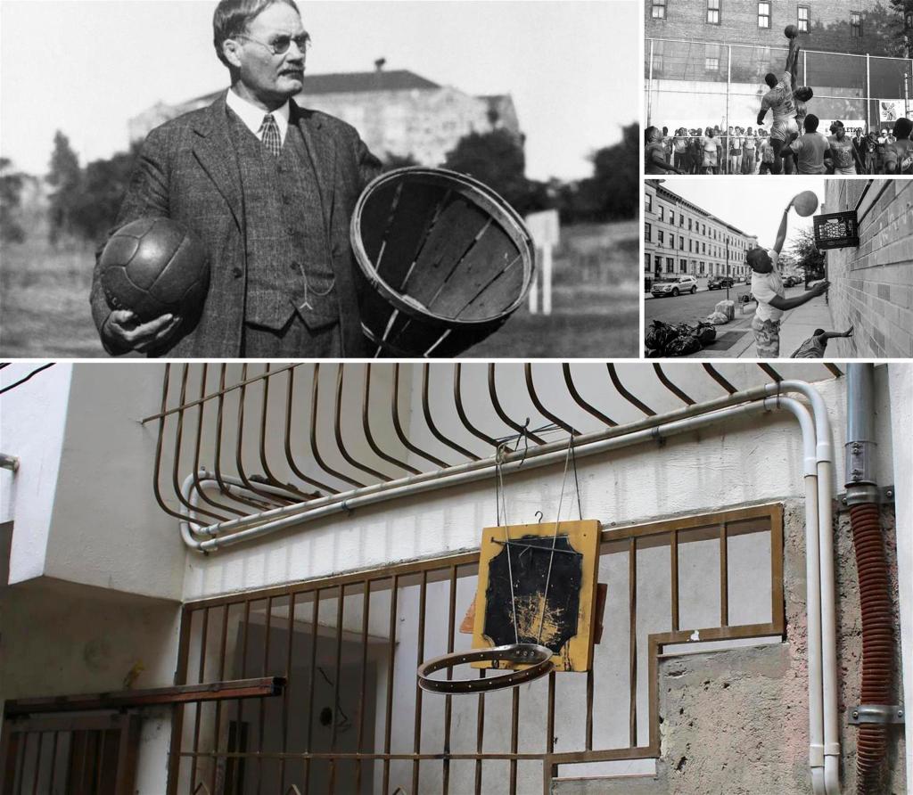 James Naismith sostiene la primera canasta – James Naismith holds the first basket 1981. Unknown author // Juego de baloncesto en Curbed – Basketball game in Curbed, NYC & Cesta improvisada en un gueto de Harlem – Makeshift basket in a Harlem ghetto. Photos: Andre D. Wagner. 2018 // Tablero y aro con un ring de bicicletas en el Barrio La Vega, Caracas – Board and hoop with a bicycle ring in Barrio La Vega, Caracas. Photo: Marcos Coronel. 2019