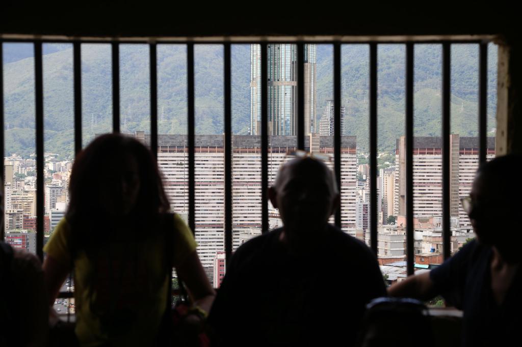 Reinaldo Mijares (señala un punto en específico), Rodrigo Marín, Gabriel Visconti y Marcos Coronel en la estación de funiculares del Barrio La Ceiba, San Agustín. Detrás impresionante, la Torre Este de Parque Central. Cerro El Avíla al fondo. 2017. Foto @Nickol Bendek