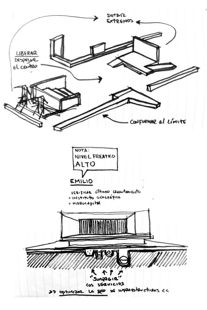 1. Estrategias del proyecto. / 2. Esquema de futuras instalaciones. Plazoleta_ Escenario de calle. Afinque de Marín. Barrio San Agustín, 2018. Boceto @Marcos Coronel