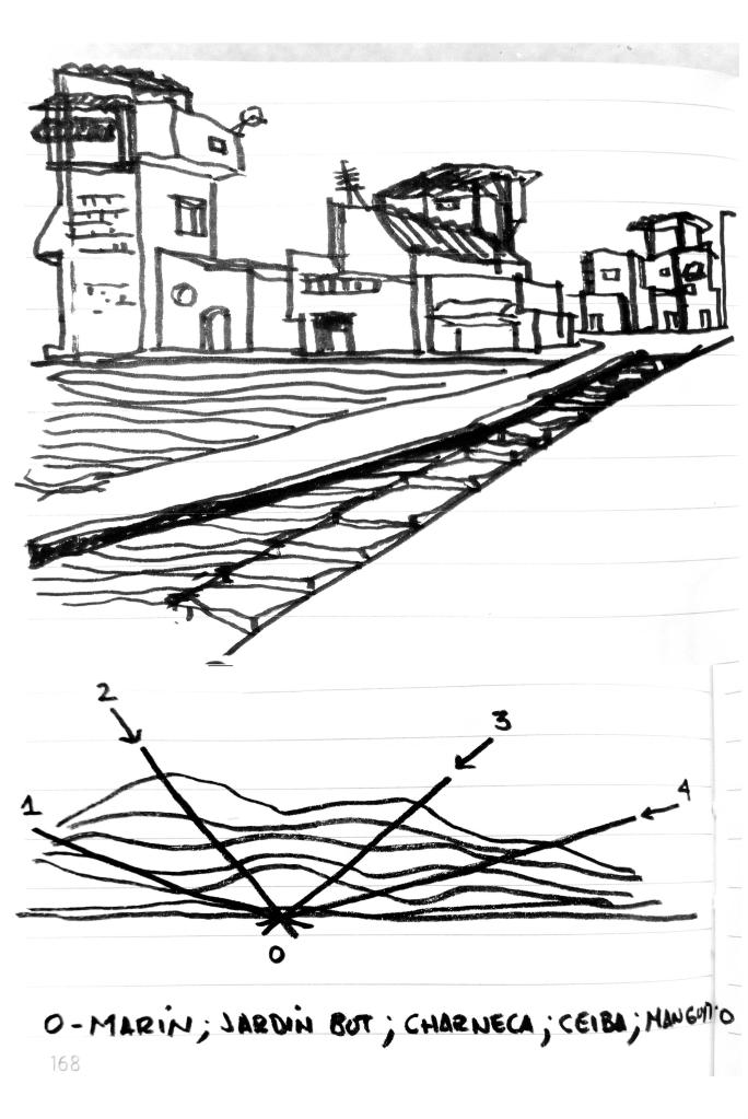 1. Trayecto a pie desde El Afinque de Marín hacia el Barrio La Ceiba. / 2. Coordenadas de Marín en los cerros de San Agustín. 2018. Boceto @Marcos Coronel.