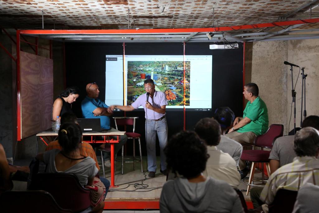 Arquitecto Rodrigo Marín proyecta imágenes durante una asamblea en el Afinque de Marín. Barrio San Agustín. 2018. Foto @Nickol Bendek