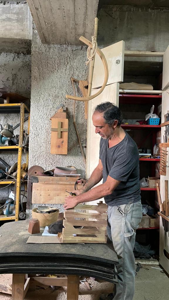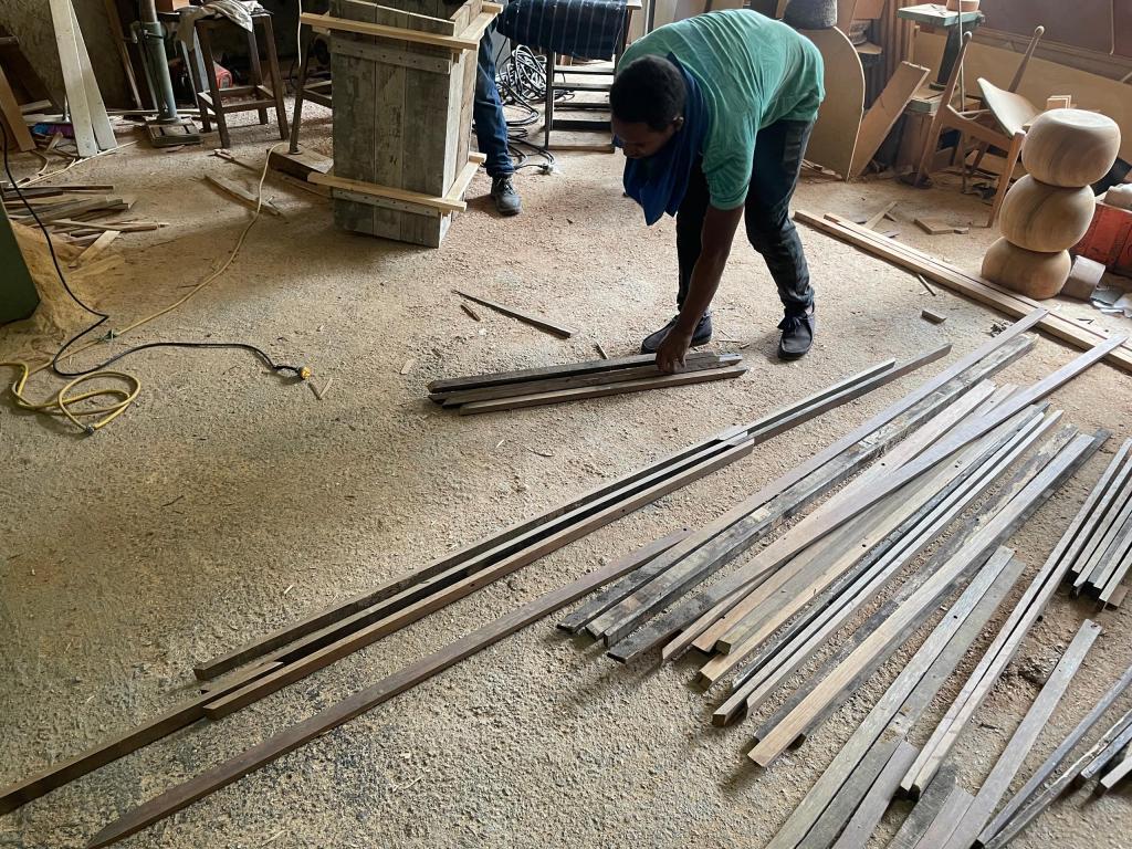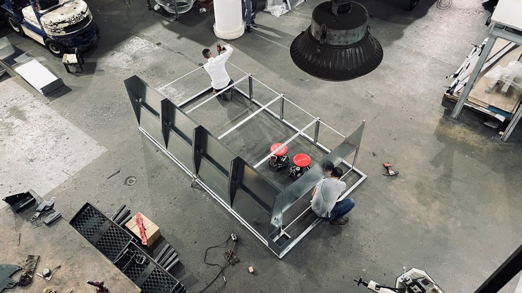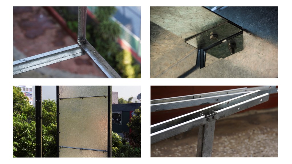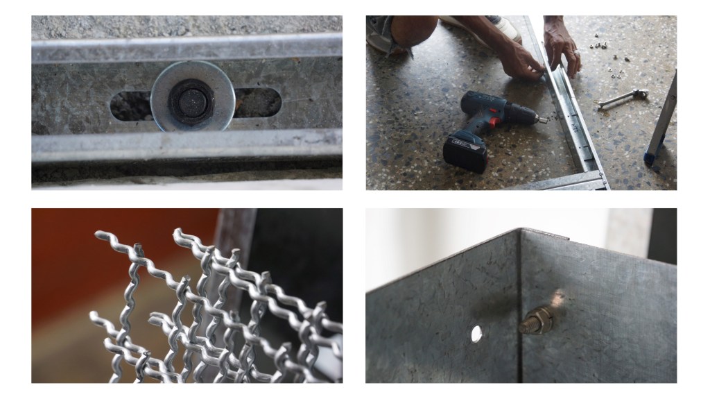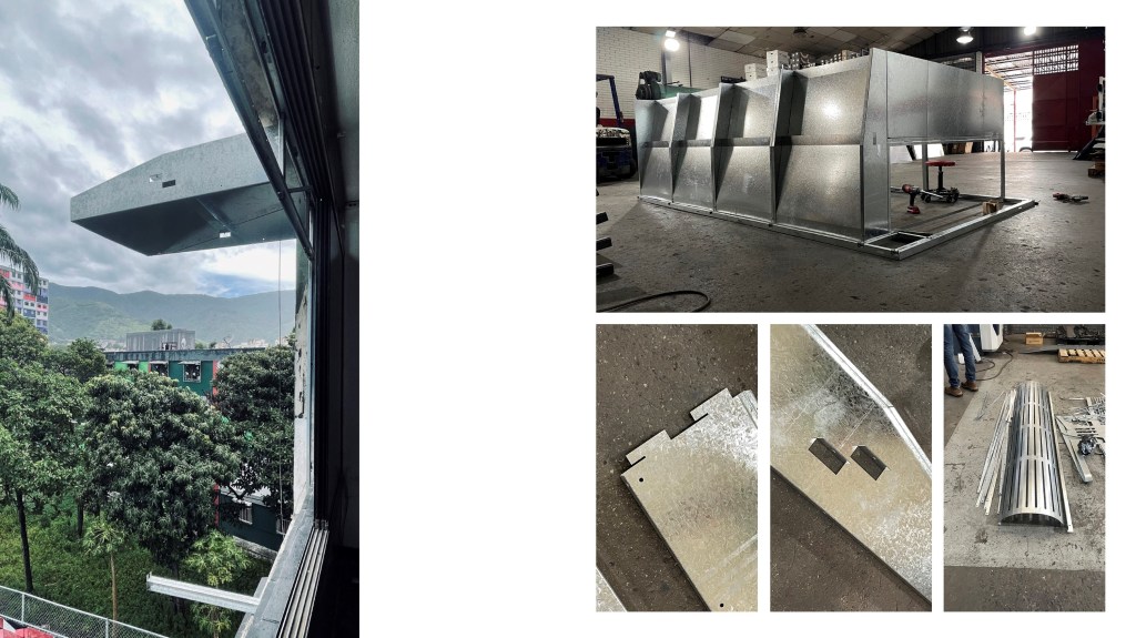 En este rol la empresa Lasercut jugó un papel fundamental. En sus laboratorios de mecanizado en acero, se confeccionaron todas las estructuras utilizando maquinas CNC de corte laser y maquinas de doblado digital. Con la participación de ingenieros mecánicos y sus técnicos especialistas, Lasercut aportó tanto los materiales, como las herramientas y el conocimiento tecnológico que permitió llevar a cabo la intervención, mediante la prefabricación de 200 componentes de acero galvanizado, los cuales se articulan con sistemas en seco, tornillos y pernos. Un kit desarmable, de fácil montaje, ultraliviano, listo para llevar, sin soldadura, sin procesos húmedos, donde también se incorporan una serie de elementos de madera (Puy) confeccionados en el taller de carpintería del arquitecto Carlos Mendoza Acosta. Una esterilla que sirve como superficie de apoyo para los objetos que reposan dentro de la estructura.
