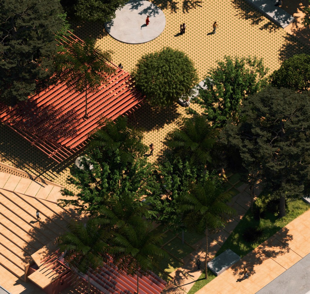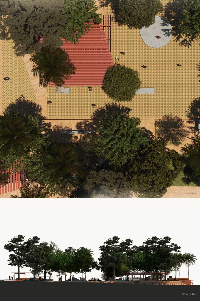 Nuestra idea fundamental era cambiar la plaza ornamental en un sitio de intensidad urbana basados en una sencilla investigación sobre su sitialidad, los materiales y el clima: Un suelo de alfarería local, poner todo a nivel, una cota única que integrara vegetación y superficies, todo usable, con accesos fluidos y una mezcla de taludes suaves y gradas para diluir los desniveles en los bordes. Una topografía domesticada, sin muros, sin obstáculos.
